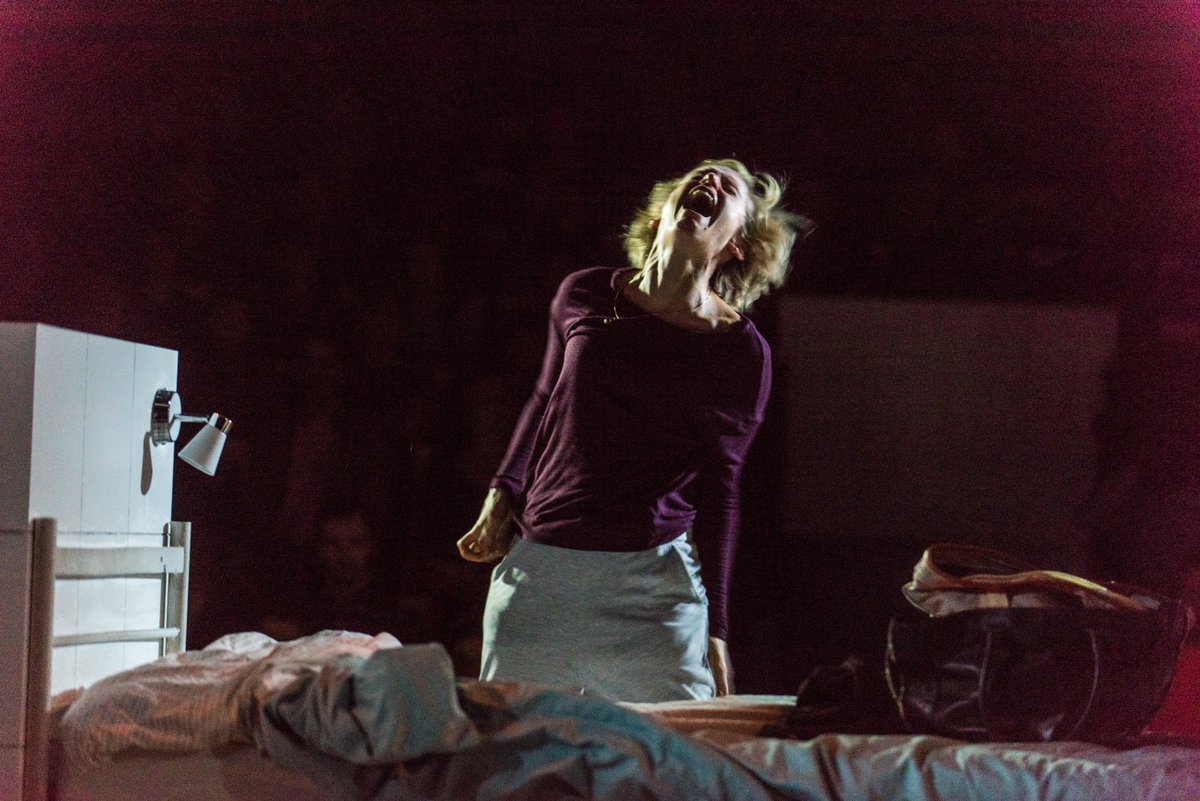 However the meat of the play is in the final scene. Emma has returned home to her parents' place. At the rehab center she and other addicts have to "practice" how they're going to make amends with loved ones once they're out in the real world. As Emma sits in her childhood bedroom and "performs" the speech she'd practiced in rehab to her real-world parents (Barbara Martens again as the mother, and Kevin McMonagle as the father), their cold reactions are both heartbreaking and understandable. They've suffered through a lifetime of Emma's addiction and they're burned out. And in one final scene, there's still ambiguity about how much of Emma's recovery is real and how much of it is a performance.